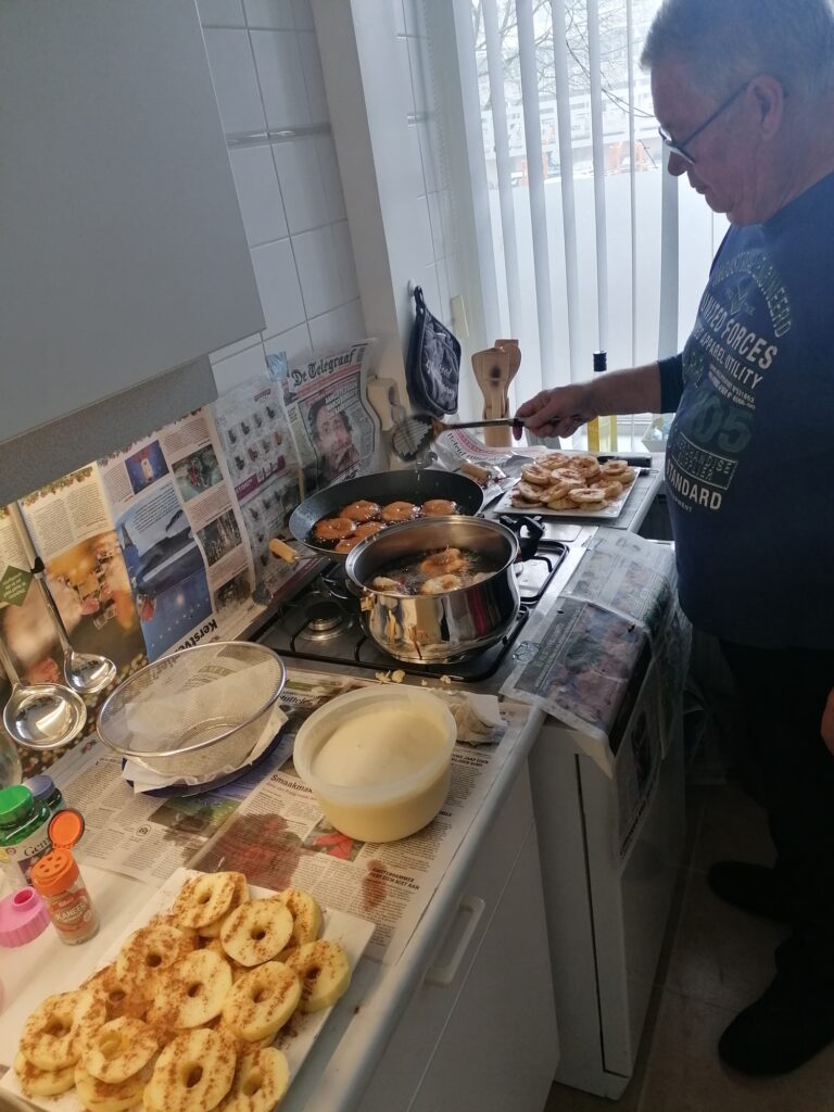 IJmuiden – Het actieve buurtcomité van het Langevlak was deze week druk in de weer met de laatste activiteit van 2021. Voor alle buurtbewoners werden, net als vorig jaar, oliebollen en appelflappen gebakken. De eindejaartraktatie werd dinsdagmiddag bij de bewoners aan de deur bezorgd.