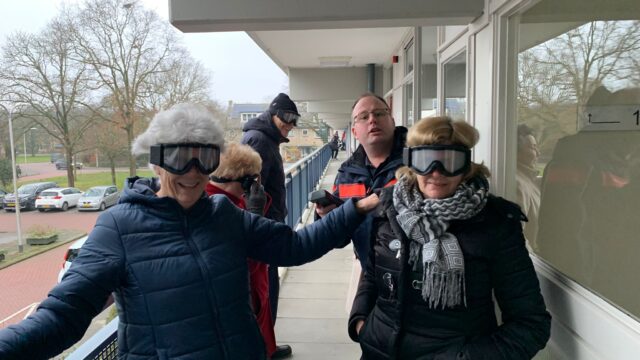 Na een korte uitleg gingen bewoners in kleine groepjes op pad met een rookmasker dat het zicht sterk beperkt. Lopend over de galerij zochten zij de weg naar de trap. Dat bleek veel moeilijker dan verwacht. Een bewoner vertelt: ,,Ik dacht dat ik de weg blind zou kunnen vinden. Maar je ziet bijna niets en raakt snel gedesoriënteerd. Maar goed dat er geen spullen op de galerij stonden, anders was ik zeker gestruikeld.”