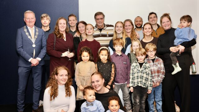 Burgemeester Frank Dales samen met Steef Hammerstein en zijn familie. Foto: Reinder Weidijk