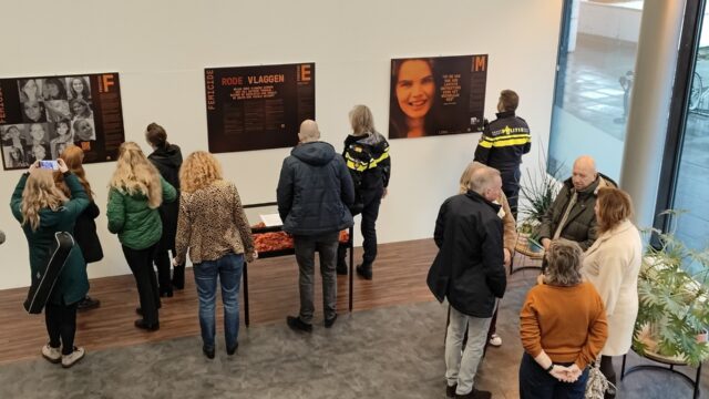 In Bibliotheek IJmuiden wordt op panelen het verhaal verteld van dertien vrouwen. Bij binnenkomst staan op een paneel de tien rode vlaggen. Er zijn ook prints beschikbaar waarop te lezen staat welke rode vlaggen – ook bij intieme terreur – kunnen duiden op escalatie van geweld of zelfs een fatale afloop. Zo wordt onder meer stalking, bedreiging, wapenbezit, gedwongen seks, onthouden van zorg, angst en schaamte bij het slachtoffer en toenemende escalatie van geweld genoemd. Wim Hertgers is lang in gesprek met onze burgervader en directeur Martine van Haventheater IJmuiden.
