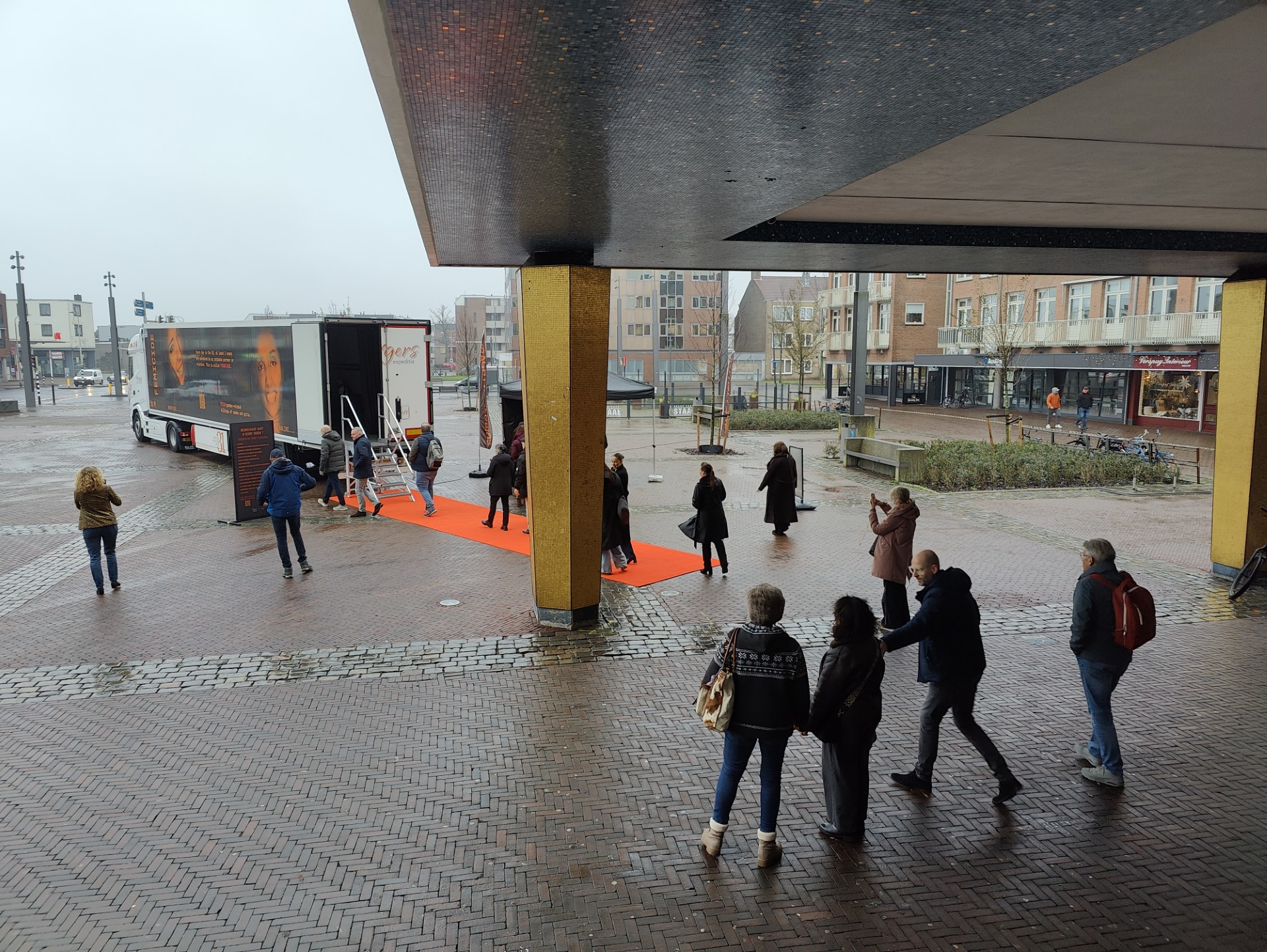Op Plein 1945 stond donderdag 27 november de hele dag de vrachtwagenbioscoop, waarin de film ‘Het ligt aan mij’ gespeeld wordt voor belangstellenden. Foto: Arita Immerzeel