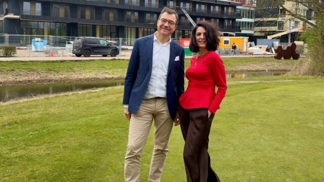 Fotobijschrift: Algemeen manager Bernard Lensink en HR-projectmanager Mirjam Swart met op de achtergrond het in aanbouw zijnde hotel. Foto: Spaarnwoude Park Hotel