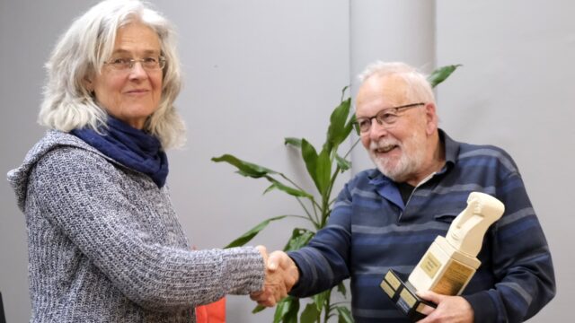 Cis Stokman krijgt de bokaal van avondvoorzitter Fred Bavius. Foto: aangeleverd