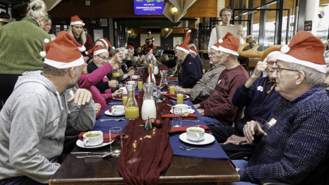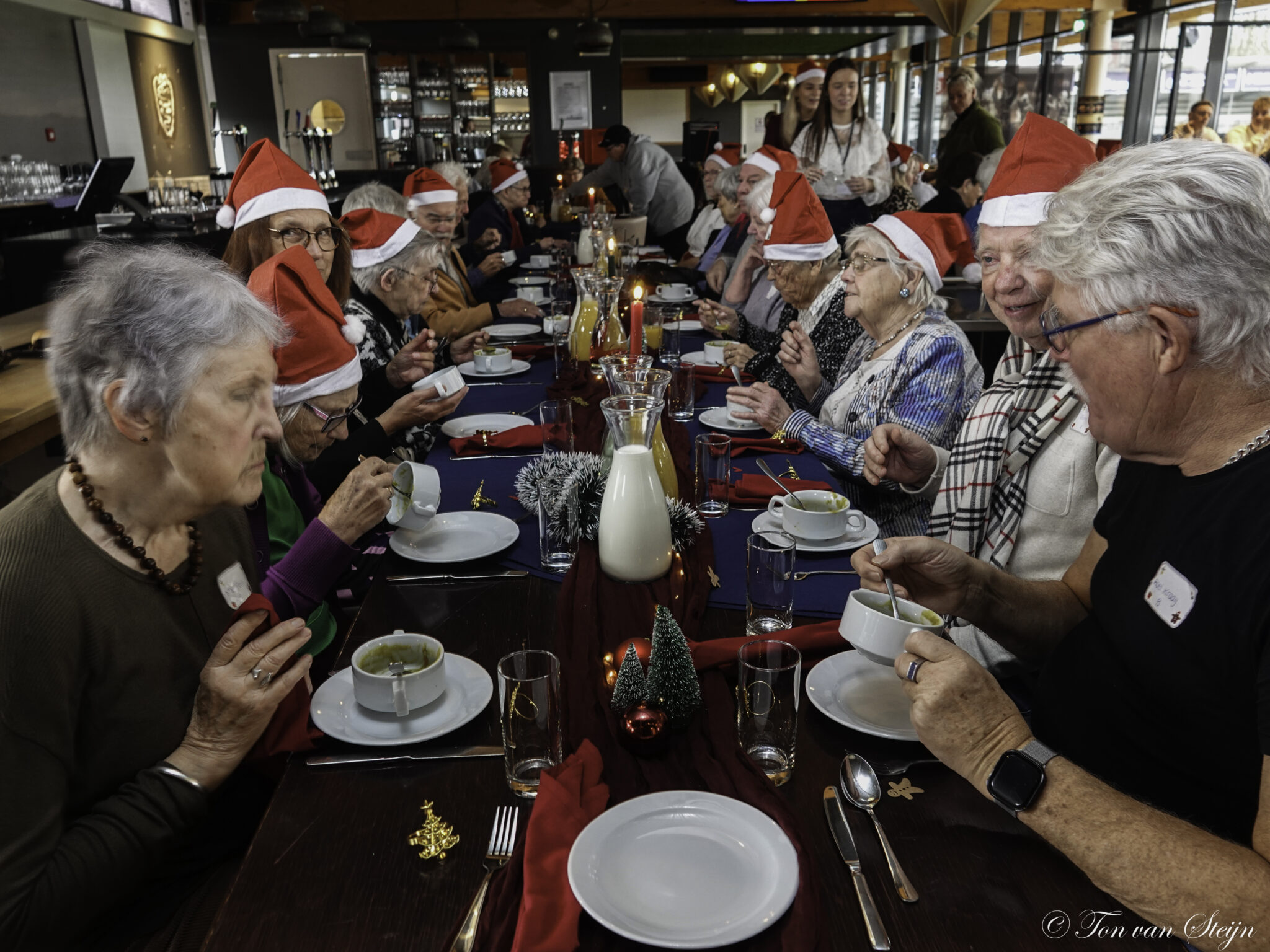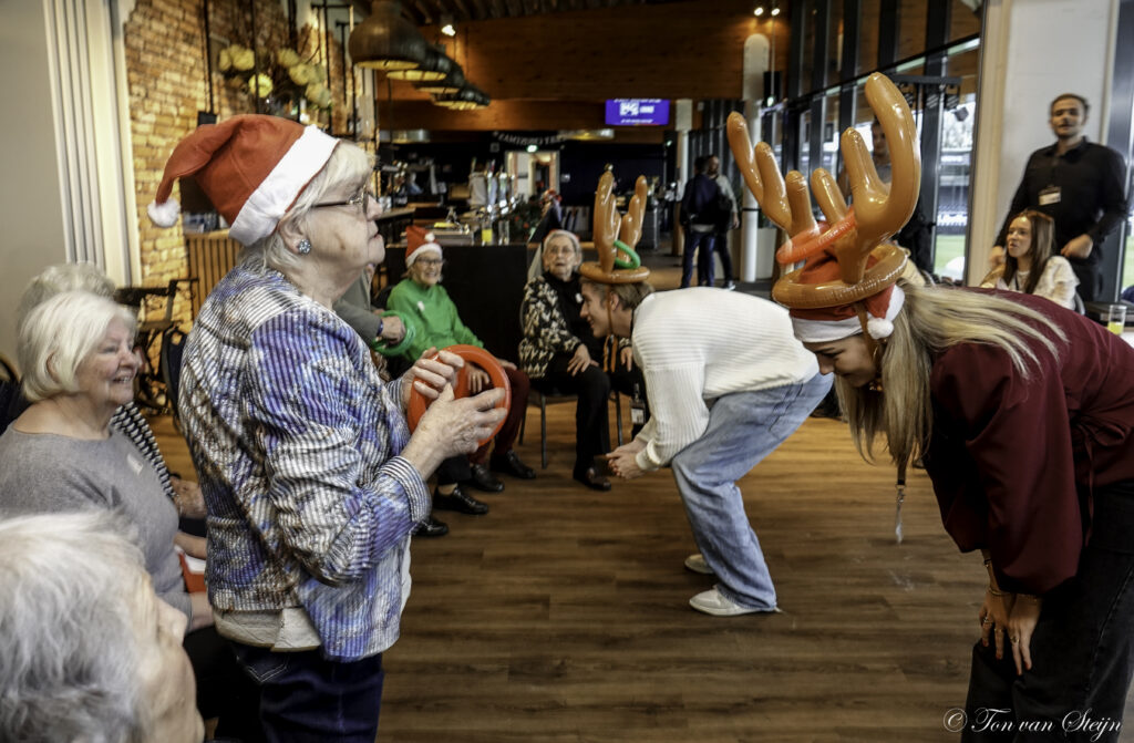 Na een uurtje, het programma begon rond 11.00 uur ’s ochtends, is het feestje echt wel aan de gang. Er staan schalen met oliebollen, er wordt gelachen en gekletst, er zijn leuke spelletjes en de meeste deelnemers zijn getooid met een kersthoed. Een hilarische hoed maar dat paste helemaal bij de stemming. Veel lol en lekker ontspannen voor de -we denken wel 60- deelnemers. In totaal lopen er namelijk 71 mensen rond, de begeleiders meegerekend.