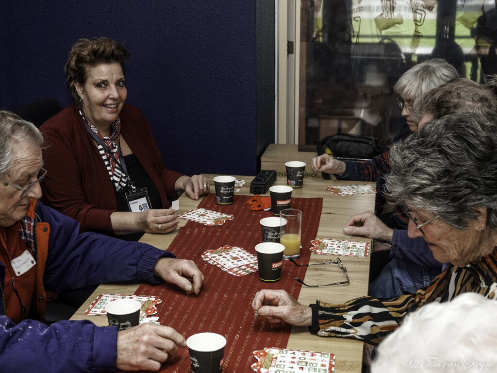 Karin Noorman, inderdaad de moeder van, zit als begeleider bij de bingo tafel waar vandaan de kreten van enthousiasme door de hele zaal heen te horen zijn. Ze heeft het een beetje te druk om te praten maar later zegt ze: ,,Ik wil me niet met je artikel bemoeien maar wat voor mij de hoofdprijs was, waren de jongelui die alles voorbereid en begeleid hebben.’’ En inderdaad, die hartstikke jonge mensen zijn zó gezellig bezig! Sophie, Lotje, Zilla, Beau, Finn, Marnix, Milan, Stephan, Mike, Emma, Laura, Tess, Antoinette, Lesley en Kas heten ze. In een tijd waarin het moeilijk is om ergens vrijwilligers voor te krijgen alle respect! Ze hebben heus wel meer te doen met studie, werk, vriendengroepen en eindejaarsfeesten en ook waarschijnlijk geen opleiding gevolgd in het begeleiden van mensen die op leeftijd zijn.