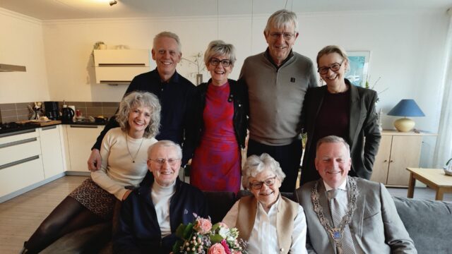 IJmuiden – Maandag was het op de dag af 65 jaar geleden dat Bep Stals en Jan Jansen elkaar het jawoord gaven en als echtpaar verder door het leven gingen. Dat feit ging toen en nu niet onopgemerkt voorbij. In 1959 was er een dienst in de kerk, een lunch, een receptie, een diner en tot slot de bruiloft. De gewoonte om te vieren wat er te vieren valt, blijkt bij het echtpaar een traditie. Een traditie met ruimte voor veel creativiteit. In het Dorpshuis in Bloemendaal werd gister met 68 gasten gegeten, gezongen, gedanst en er werden veel stukjes opgevoerd. En vandaag stapt burgemeester Frank Dales het huis binnen. Er klinkt gejuich, want Frank draagt zijn ambtsketen. Samen met zoon en dochters vertellen Jan en Bep Jansen over hun rijkdom: hun familieleven.