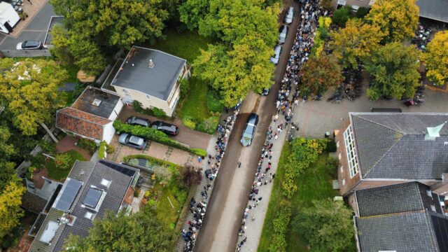 Leerling uit de derde klas Luc Slutter heeft de erehaag met zijn drone gefilmd. Hij vertelt: ,,Vliegen met mijn drone is een grote hobby van me, dus toen ik in de brief las dat school ging proberen om de erehaag met een drone te laten filmen heb ik meteen contact opgenomen. Ik vind het heel erg belangrijk voor de familie dat zij een mooie video en foto’s hebben van bovenaf. Als je zo lang op een school gewerkt hebt, hoe mooi is het dan als alle leerlingen en collega’s een erehaag maken. Ik heb dit vastgelegd met mijn drone en zo heeft de familie een mooi aandenken’’.