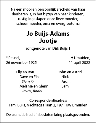 Jo Buijs-Adams Jootje (26-11-1925 – 11-04-2022)