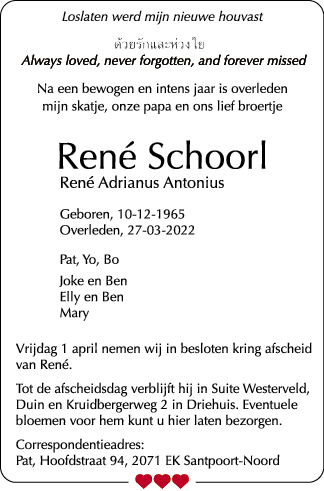 Op deze pagina vindt u het overlijdensbericht van René Adrianus Antonius Schoorl (10-12-1965 – 27-03-2022) aangeboden door de uitvaartondernemer of de familie welke gepubliceerd is in De Jutter / De Hofgeest.