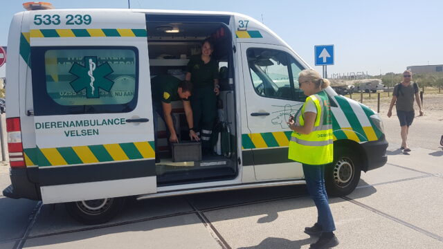 IJmuiden aan Zee – Het viel strandganger Fred al op tijdens zijn ochtendwandeling langs de vloedlijn. Een stern probeerde het water uit te komen, maar viel telkens opzij en het lukte maar niet. Met in gedachten alle slachtoffers op Texel en in Zeeland, waar hele groepen sterns door de vogelgriep uitgeroeid zijn, belde hij de Dierenambulance Velsen. Een auto van de Reddingsbrigade haalde de stern op en bracht hem naar de Dierenambulance, die klaarstond op de parkeerplaats bij het grote strand. Het kopje van de zieke stern bleef in beweging. Medewerkers van de Dierenambulance, die de stern naar professionele hulp gingen brengen, zeiden dat ze het ook niet zeker weten of vogelgriep de vogel ziek maakte. Sterns eten soms ook peuken en plastic, achtergelaten door strandgangers. Daar worden ze ook niet lekker van, omdat zij dat niet kunnen verteren. Het blijft in hun maag achter en belemmert dan een gezonde maaglediging. Met alle gevolgen van dien.