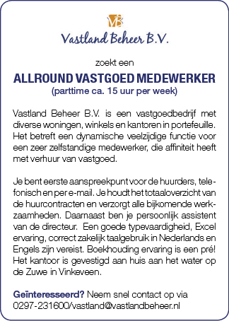 Vastland Beheer B.V. is een vastgoedbedrijf met diverse woningen, winkels en kantoren in portefeuille. Het betreft een dynamische veelzijdige functie voor een zeer zelfstandige medewerker, die affiniteit heeft met verhuur van vastgoed.