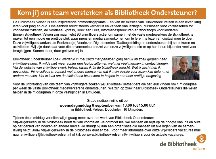 Voor de uitbreiding van ons team van vrijwilligers zoeken wij Bibliotheek liefhebbers die het leuk vinden om 1 middagdeel per week de vaste Bibliotheek medewerkers te ondersteunen. We zijn op zoek naar Bibliotheek Ondersteuners die willen helpen in de middaguren in onze vestigingen in IJmuiden.