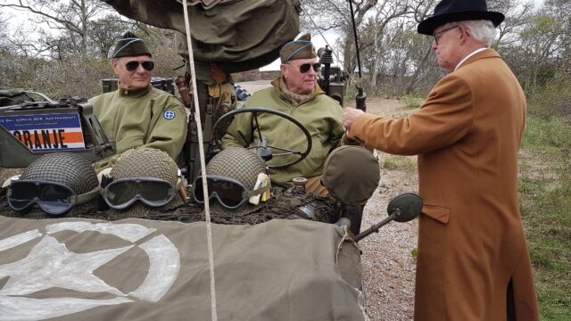 Een burger in kleding van toen biedt de geallieerde bevrijders een pikketanussie aan. (Foto: Arita Immerzeel)