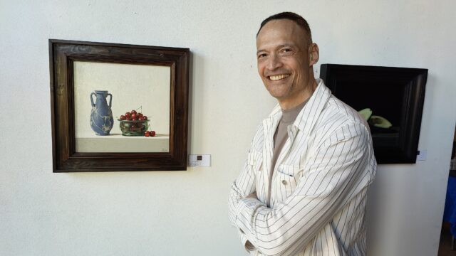 Velsen – Op het adres Torenstraat 7 in Velsen-Zuid exposeert fijnschilder Marcel Ruben in de Raadzaal met realistische olieverfschilderijen, gevat in ambachtelijk vervaardigde lijsten, die ook van zijn hand zijn. De expositie is tot en met 12 april te bezoeken, op 1e Paasdag na, op vrijdag, zaterdag en zondag van 13.00 tot 17.00 uur. Foto: Arita Immerzeel