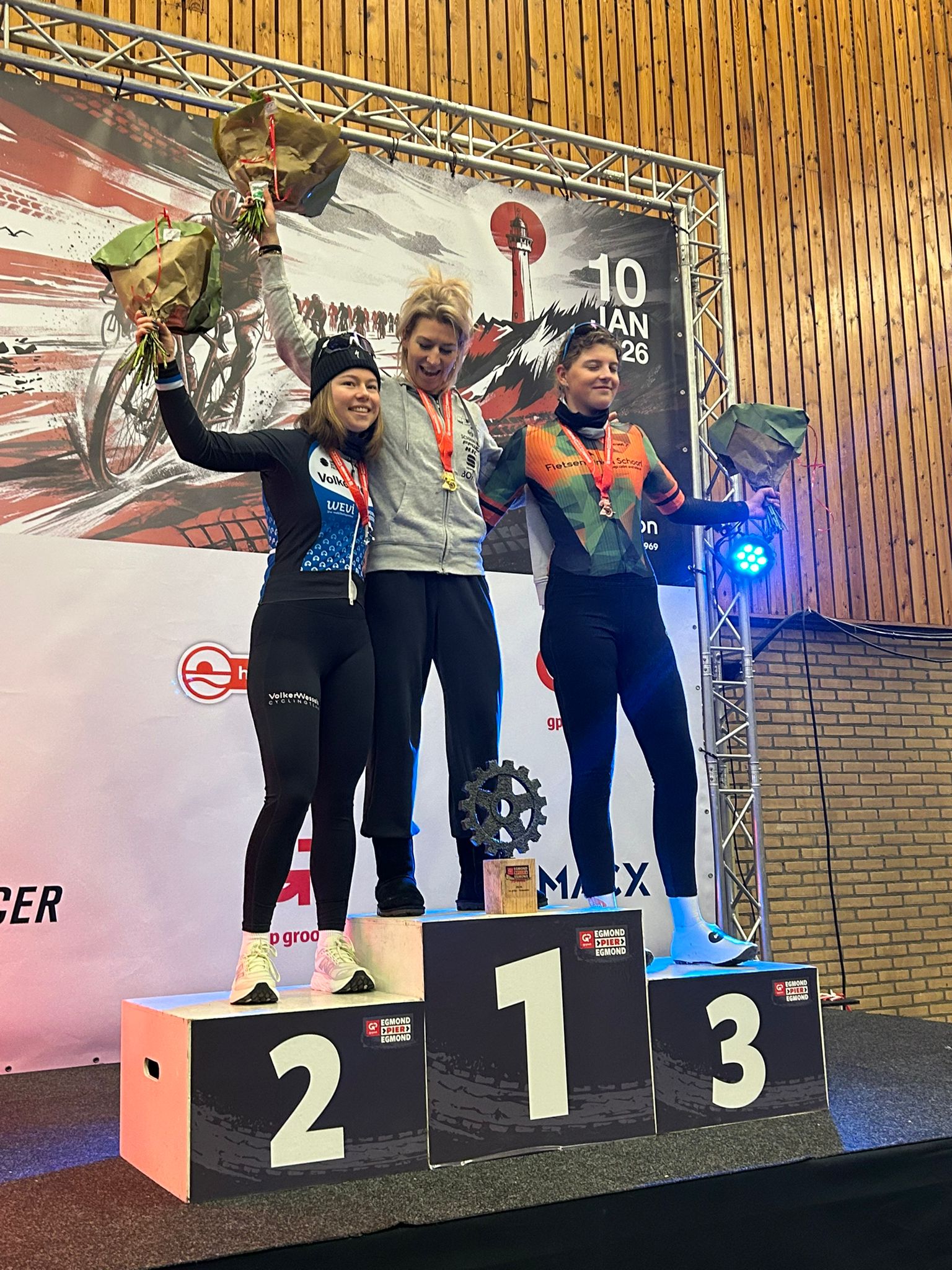 In de ijzige kou stonden om 11.00 uur de dames klaar voor hun race van 38 km over het strand. Al snel ontstond er een kopgroep van acht rensters. Na bij Wijk aan zee het strand verlaten te hebben begon de terugweg naar Egmond. Ook bij Castricum moesten de dames even het strand verlaten.Bij terugkomst op het strand moesten de rensters het laatste stuk tegen de ijskoude wind in weer richting Egmond. Nina demarreerde, ging in de aanval dus, maar kreeg drie rensters mee. Vlak voor Egmond werden ze weer bijgehaald en waren ze weer met z’n achten.