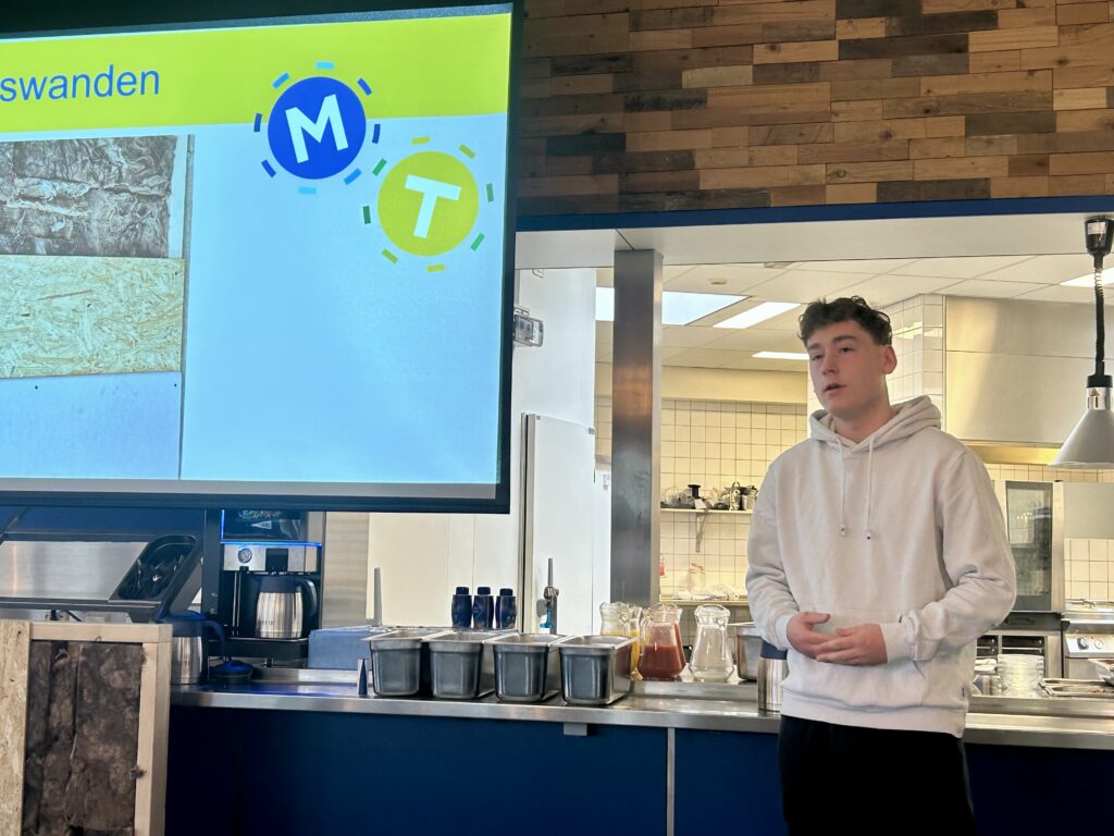 En dan de leerlingen zelf. De stagekanjers worden dit keer gepresenteerd door middel van een filmpje, dit om alles ze eerlijk mogelijk te laten verlopen. Vorige jaren werd er een pitch gehouden door de stagebegeleiders maar je kunt hartstikke goed zijn in je vak en heel goed kunnen begeleiden maar dat wil niet zeggen dat je ook een begenadigd spreker bent. Jasper Teeling liep stage bij Scheffer Sminia en als je naar het filmpje kijkt lijkt het alsof hij nooit anders heeft gedaan. Heel geconcentreerd ook en met veel plezier. Hartman zegt dat dit bij een wiskundeles wel eens anders is. Dat snapt iedereen. Frank Spijker vervulde zijn stage bij Dijkman Sloop- en Grondwerken. Het is een grappig filmpje geworden en iedereen is overtuigd dat Frank goed bezig is. Brody Wouda presenteert na de tweede ontbijtronde het winnende profielwerkstuk en de aandacht van de aanwezigen is gericht op scheidingswanden in de meest duurzame samenstelling.