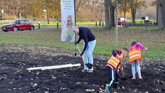Wethouder Gideon Nijemanting plantte de eerste boom, geholpen door twee kinderen van BSO De Boomhut. Foto: Bos Media Services)
