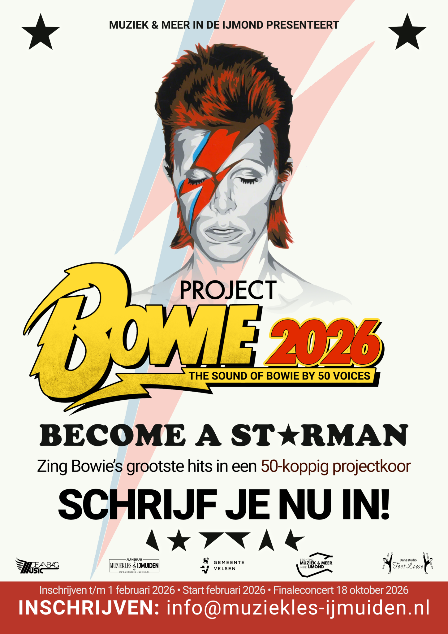 Eerdere projecten rondom artiesten als Queen, Michael Jackson, Genesis, The Wall en Police & Sting waren zeer succesvol en trokken volle zalen. Veel deelnemers keren jaarlijks terug, wat de sterke community rondom deze projectkoren benadrukt. Met Project Bowie zet Stichting Muziek & Meer in de IJmond opnieuw een groots en uniek cultuurproject neer dat zelden in deze vorm in Nederland te zien is: een tijdelijk koor als artistieke productie, waarin vijftig stemmen samen één iconische artiest tot leven brengen. Inschrijven kan tot 1 februari 2026. Meer informatie: www.muziekenmeerindeijmond.nl/bowie.