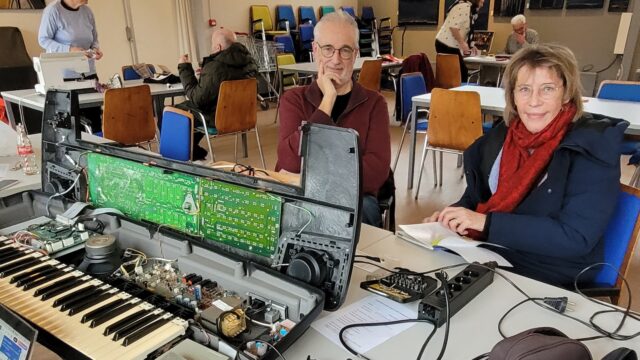 In het Repair Café werden al snel een aantal mogelijke oorzaken uitgesloten, maar een handleiding bleek onvindbaar. Tot reparateur Pieter op een Portugese website een manual ontdekte. Mét Engelse vertaling, gelukkig. Het probleem bleek elektronisch van aard: een mooie uitdaging. Deze middag lukte het nog niet om de Roland weer tot leven te wekken, maar de hoop is springlevend.