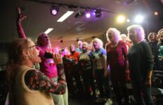 Fotobijschrift: Het oudejaarskoor van Koel tijdens het nummer ‘Baas van deze krant’, met op de voorgrond links Guus op jonge leeftijd, de redactie van De Lokaale Krant en Guus ‘nu’. Foto: Erik Baalbergen