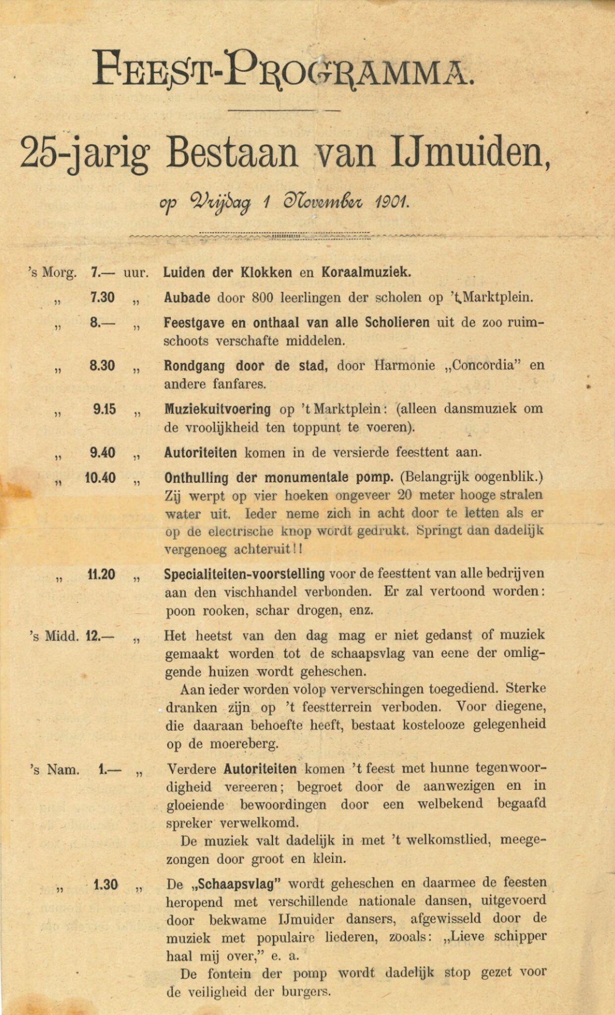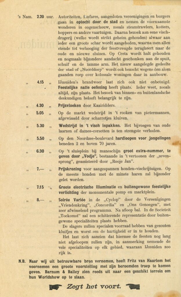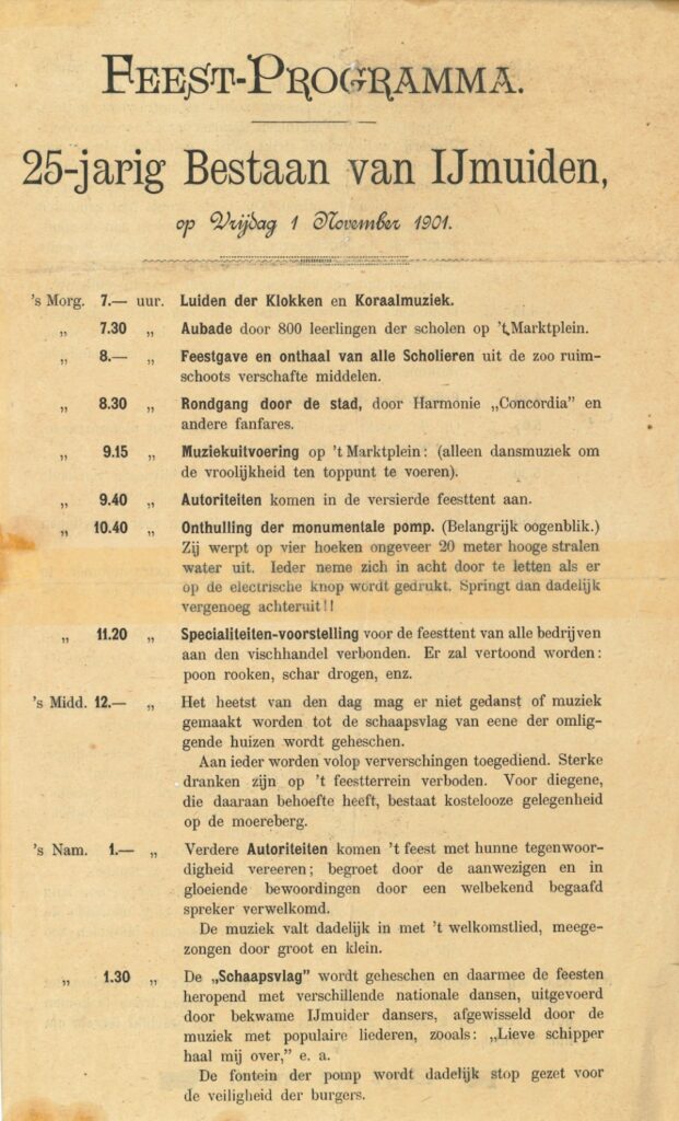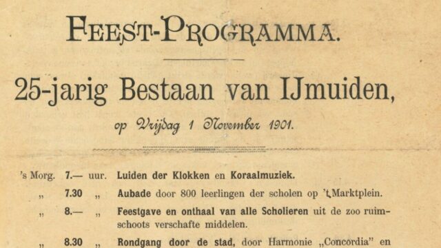 Een grappenmaker grijpt het uitblijven van een feest voor de IJmuidenaren aan om een pamflet met een ‘Feest-Programma 25-jarig Bestaan van IJmuiden’ te verspreiden. Het satirische feestprogramma bevat 21 fraaie onderdelen, zoals het hijsen van de Schaapsvlag (vlag van de gemeente Velsen), Prijsvloeken door Kaairidders en een wedstrijd in Visch-inpakken, waarbij het ‘bijvoegen van oude laarzen of dames-corsetten’ verboden is. In de boeken ‘Bles voor de Kop’ en ‘Eene Plaats van Grooten Omvang’ staan afdrukken van (delen) van dit programma. Via Esther van het Noord-Hollands Archief heb ik scans van een origineel exemplaar mogen ontvangen, zodat ik de lezer hierbij een mooie afbeelding van het feestprogramma kan tonen!