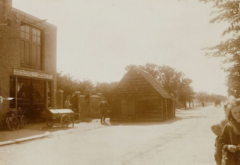 In de Beeldcollectie van de gemeente Velsen bevinden zich drie foto’s van het hetzelfde huisje, zeg maar woonkeet, in de Trompstraat. De foto’s zijn rond hetzelfde moment in 1914 gemaakt en tonen de woonkeet vanuit verschillende posities. Rond de keet poseren steeds dezelfde twee mannen en een paar kinderen. De foto’s gunnen ons een blik in de dan nog jonge Trompstraat. Wat vooral opvalt is dat de keet ‘op straat’ staat, en niet in de lijn van de nieuwbouw van die tijd. Om te begrijpen hoe dat zo komt, nemen we even een duik in de achtergrond van dit tafereeltje en daarmee in de geschiedenis van IJmuiden.