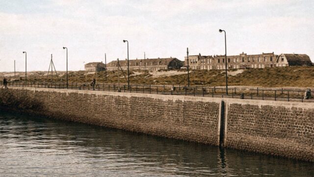 Het einde van de Blikkenbuurt komt met de aanleg van de Noordersluis. Hiertoe wordt vanaf 1919 een flink stuk van de Breesaap met zijn bosgebieden en het omliggende duingebied opgeofferd. Met de zogenoemde IJzeren Man, een grote graafmachine, worden de duinen afgegraven. Het zand wordt gebruikt bij onder meer de bouw van het Amsterdamse Olympisch Stadion en de aanleg van wegen. De Blikkenbuurt, met dan zo’n honderdvijftig woningen, wordt in het begin van de jaren twintig gesloopt voor de aanleg van het buitentoeleidingskanaal en valt uiteindelijk ten prooi aan de IJzeren Man. Gezinnen moeten hun huizen verlaten, zonder dat er vervangende woonruimte beschikbaar is. De IJmuider Courant van een eeuw geleden vindt het jammer dat er in de dagen van woninggebrek zoveel huizen moeten verdwijnen, maar betreurt het verdwijnen van de Blikkenbuurt niet. Wederom een oordeel van “elitaire IJmuidenaren”?Fotobijschrift: Een van de weinige afbeeldingen van een gezicht op de Blikkenbuurt ten noorden van de Middensluis, 1920. Foto: Noord-Hollands Archief / Beeldcollectie van de gemeente Velsen, invnr. 3027. Met behulp van AI heb ik de oorspronkelijke foto in slechte kwaliteit bijgewerkt tot een toonbaarder resultaat