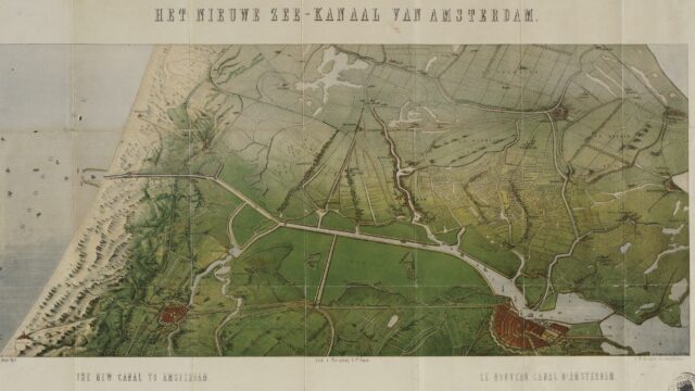 Kaart met het gebied van het Noordzeekanaal, 1866, steendruk in kleur, uitg. C.F. Stemler, Amsterdam 1866. (Afbeelding: Noord-Hollands Archief / Collectie van kaarten en kaartboeken van de Provinciale Atlas Noord-Holland, inv.nr. 273)