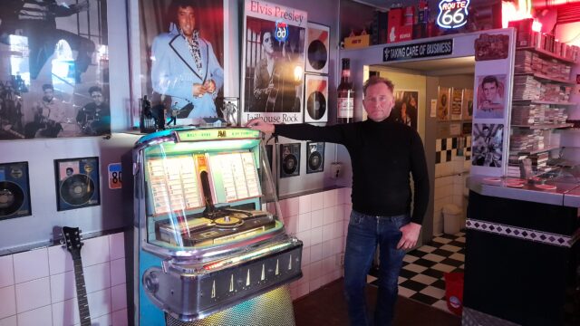 Veel inwoners van IJmuiden kennen Geert Smeding van zijn ambachtelijke visrokerij in het havengebied. Een echt familiebedrijf, want niet alleen zijn vrouw en zijn zoon werken in de zaak, ook zijn moeder, zus, oom, nichtje en schoondochter dragen hun steentje bij. Achter de winkel bevindt zich een ruimte die dienst doet als bedrijfskantine, maar waar Geert ook zijn feestjes voor familie en vrienden kan geven. De inrichting is ontleend aan die van de typisch Amerikaanse diners, waar de bankjes bij de tafels met leer zijn bekleed en waar je ook op een kruk aan een lange bar kunt plaatsnemen. Neonreclames van het biermerk Budweiser en van Route 66 sieren de wanden, evenals kentekenplaten van Amerikaanse auto’s en bijzondere affiches. Op de tafels staan servettenhouders, de servetten hebben dollarbiljetten als opdruk. Een echte blikvanger is de originele jukebox met zestig singles erin. Natuurlijk muziek uit de jaren 50 en 60, maar niet alleen van Elvis Presley. Om het beeld compleet te maken staan er ook een elektrische gitaar en een microfoon. Aan de wand erachter hangen verschillende gouden platen van ‘The King’. ,,Replica’s, want de echte zijn niet te betalen’’, zegt Geert.