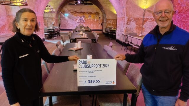 IJmuiden – Een mooie cheque van maar liefst 359,55 euro werd vorig weekend door RABO ClubSupport 2025 overhandigd aan Vereniging Forteiland IJmuiden. Namens de groep vrijwilligers willen Franciska en Leo Knape de sponsoren hartelijk bedanken. Het mooie bedrag zal besteed gaan worden aan PR-materiaal. (Foto: Vereniging Forteiland IJmuiden)