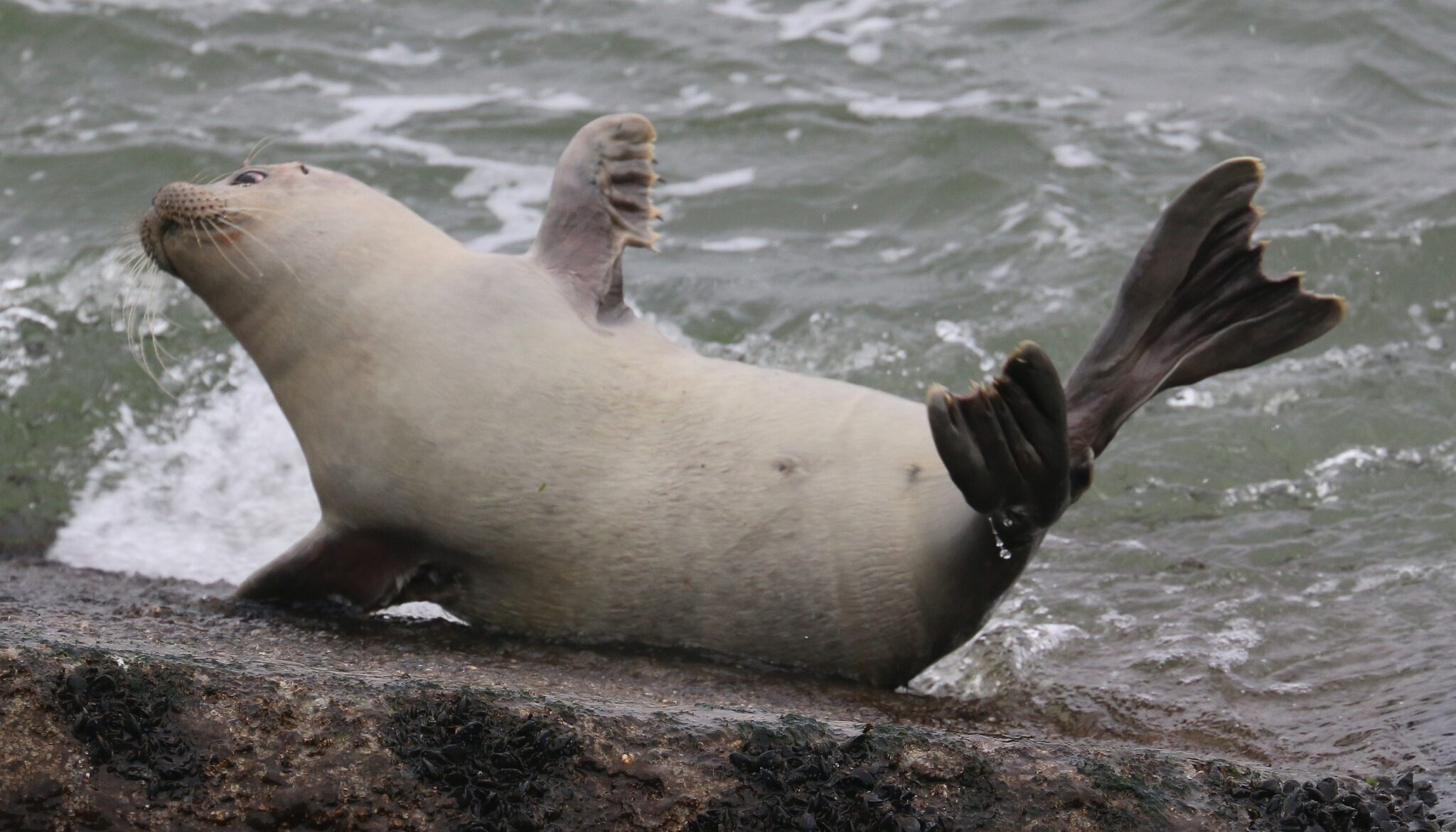 IJmuiden – Dit zeehondje trok vorige week veel bekijks vanaf de Zuidpier. Zo lig je nog lekker te chillen, en zo word je door een boeggolf van de loodstender Maud vanaf je luie blok gespoeld! (Foto’s: Erik Baalbergen)